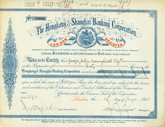 Die Bank wurde am 3. März 1865 vom Schotten Sir Thomas Sutherland in der britischen Kolonie Hongkong und einen Monat später in Shanghai gegründet. Sie sollte vom beginnenden Handel mit China profitieren. Aus Furcht vor einem japanischen Einmarsch in Hongkong verlegte die Bank den Sitz 1941 nach London. Bereits 1946 wurde der Firmensitz wieder zurück nach Hongkong verlegt. Nach zahlreichen Zukäufen wurde im Jahr 1991 die HSBC Holdings plc mit Sitz in London als Holding-Gesellschaft für die Gruppe gegründet. Mit einem Börsenwert von rund 100 Milliarden Pfund ist HSBC heute nach Royal Dutch Shell die zweitgrößte an der London Stock Exchange gelistete Firma.